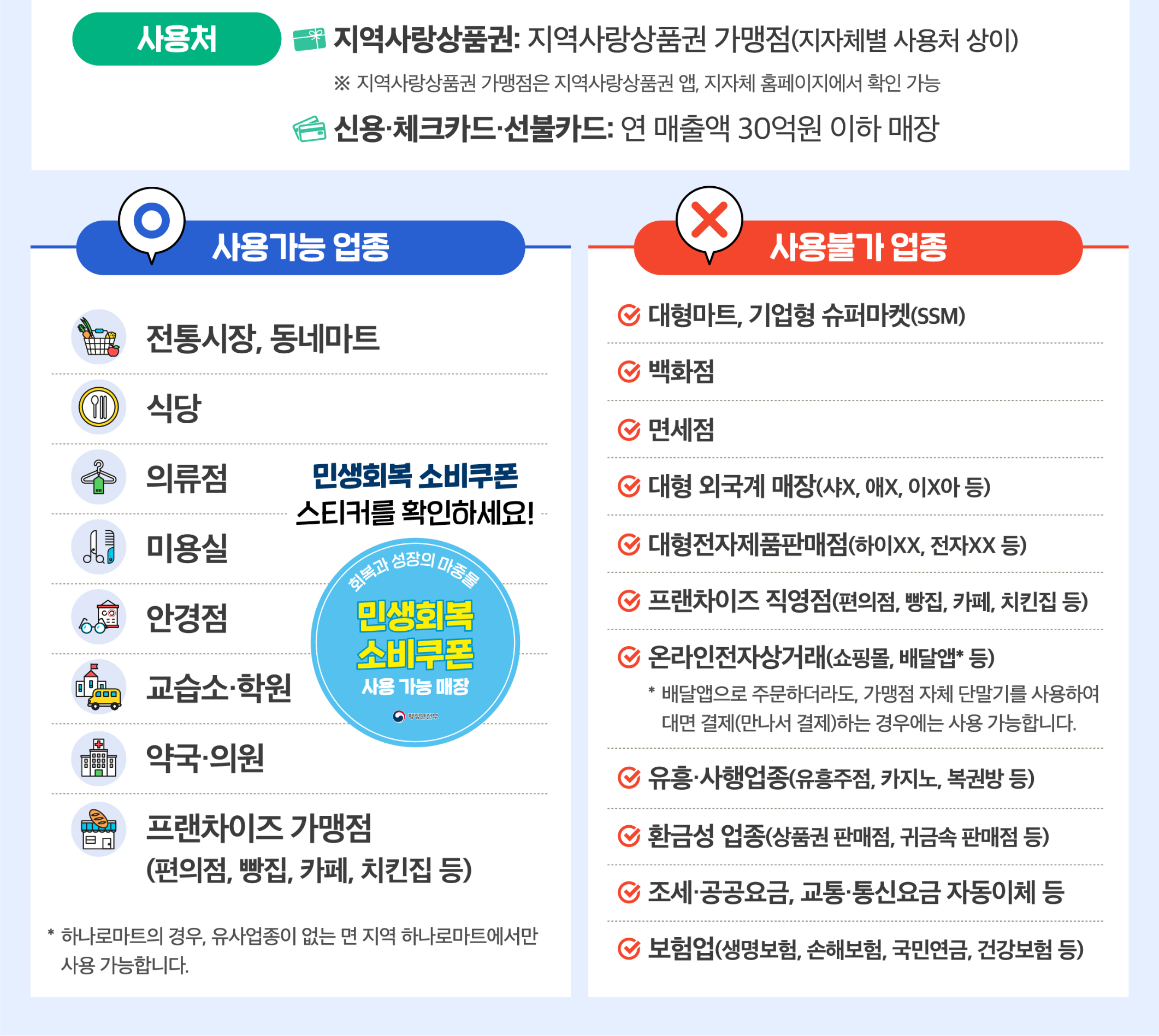• 사용처는 반드시 ‘민생회복 소비쿠폰 가맹점 스티커’를 확인하고 이용하세요.